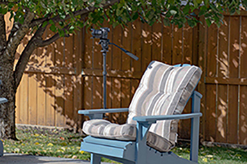For myself I mounted it to a wooden lawn chair in my backyard. I can sit or stand and take pictures. If I am going to a park, I can even clamp it to a picnic table. It can go from thirteen inches to thirty-five inches long. For a tripod head, I use the same as Emily Quattrocchi, the Neewer Video Camera Tripod Fluid Drag Pan Head.